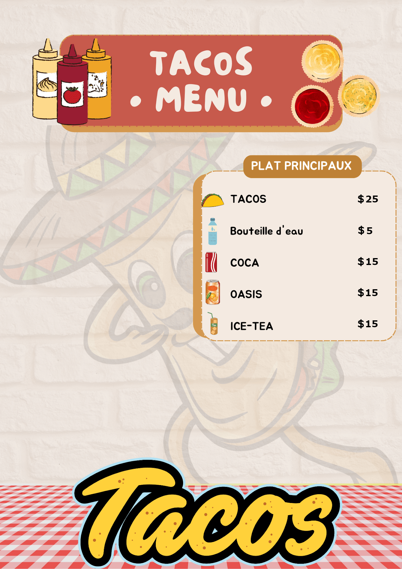 Détails de notre carteNourriture: ⬝ Tacos [Spécialité] $25